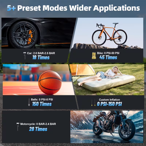 The large high-definition LCD display provides real-time pressure readings in PSI, BAR, and KPA for accurate inflation. Multiple preset modes allow quick inflation for car tires, motorcycles, bicycles, sports balls, and air mattresses, making it a versatile companion for daily driving and outdoor travel.